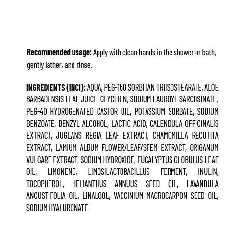 Ingredients: Aqua, PEG-120 Methyl Glucose Dioleate, Glyceryl Stearate, Aloe Barbadensis Leaf Juice, Glycerin, Sodium Lauroyl Sarcosinate, Sodium Cocoyl Isethionate, PEG-40 Hydrogenated Castor Oil, Potassium Sorbate, Sodium Benzoate, Benzyl Alcohol, Lactic Acid, Calendula Officinalis Extract, Juglans Regia Leaf Extract, Chamomilla Recutita Extract, Lamium Album Flower/Leaf/Stem Extract, Urtica Dioica Extract, Sodium Hydroxide, Eucalyptus Globulus Leaf Oil, Limonene, Limosilactobacillus Ferment, Inulin, Tocopherol, Helianthus Annuus Seed Oil, Lavandula Angustifolia Oil, Linalool, Melaleuca Alternifolia Leaf Oil, Sodium Isethionate.